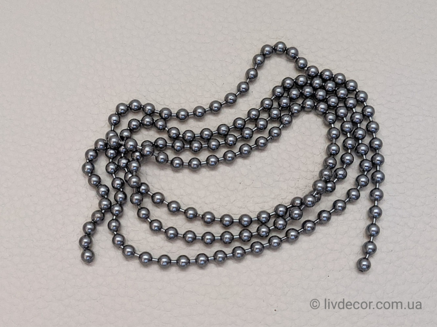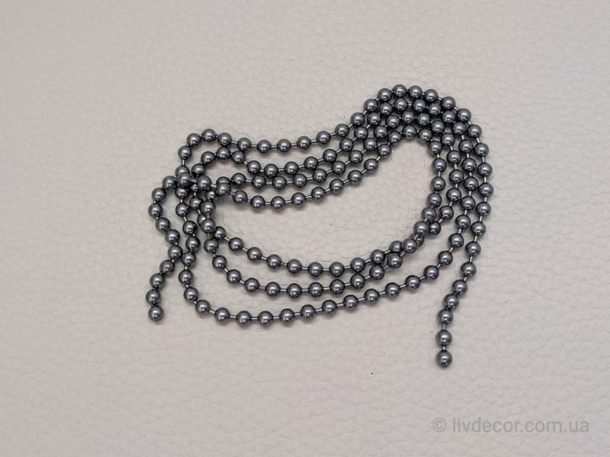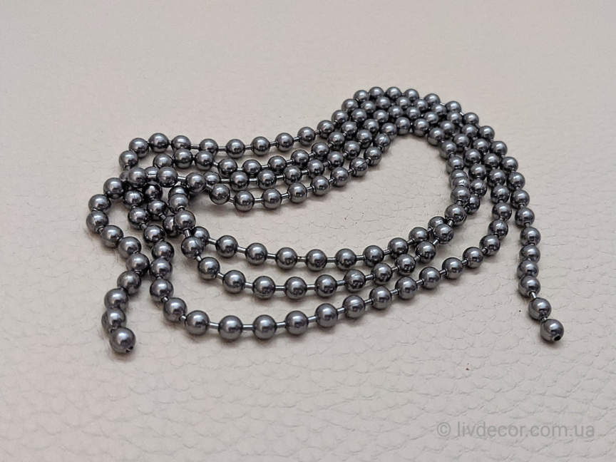 Ланцюжок керування римськими шторами металевий "Сатин" - це шнур з маленькими кульками діаметром 4.5мм з відстанню (кроком) між центрами кульок 6.2мм. За допомогою ланцюжка запускається в рух підйомний механізм керування.