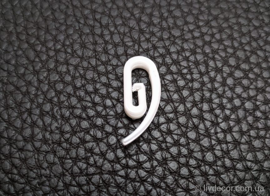 Гачок пластиковий «сігма»( «французький») використовується для штор на шторній стрічці. Гачок вставляється в бігунок профільних карнизів. Особлива форма гачка надає надійну і міцну фіксацію штори. Для цього достатньо просунути «хвостик» гачка в кишеньку тасьми і зафіксувати. Стандартний розрахунок необхідної кількості гачків – 1шт на кожні 10см.