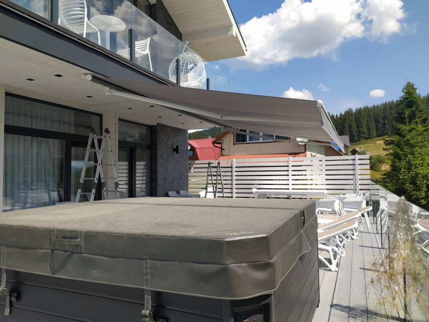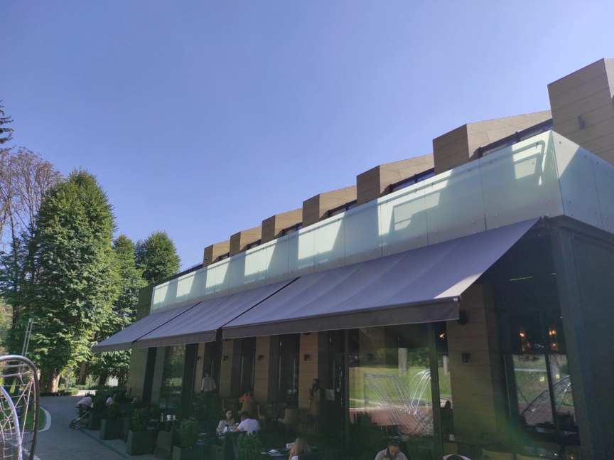 Для маркізи використовується акрилова тканина фірми Sattler, яка не пропускає воду і не вигорає.