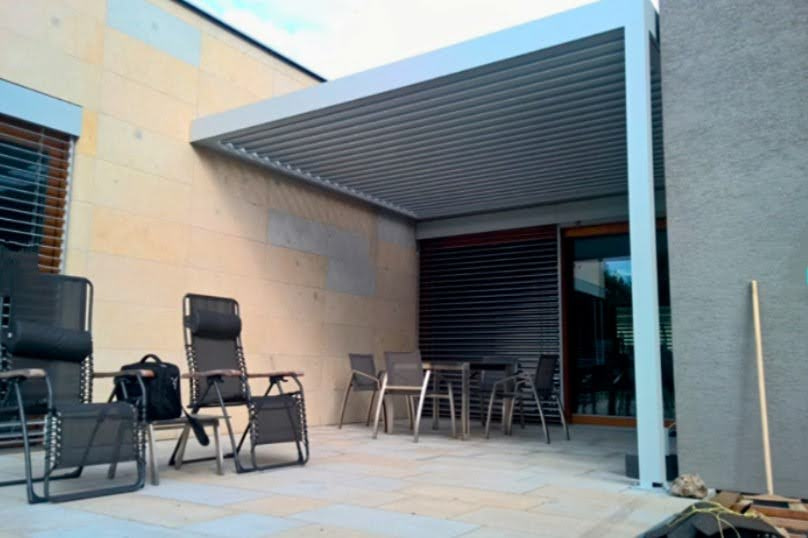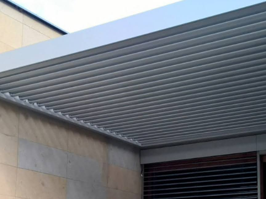 Пергола ламельна Barda 200 - це алюмінієва пергола з двома стійками, яка примикає до фасаду, забезпечує надійне накриття та ідеальне затінення на терасах.